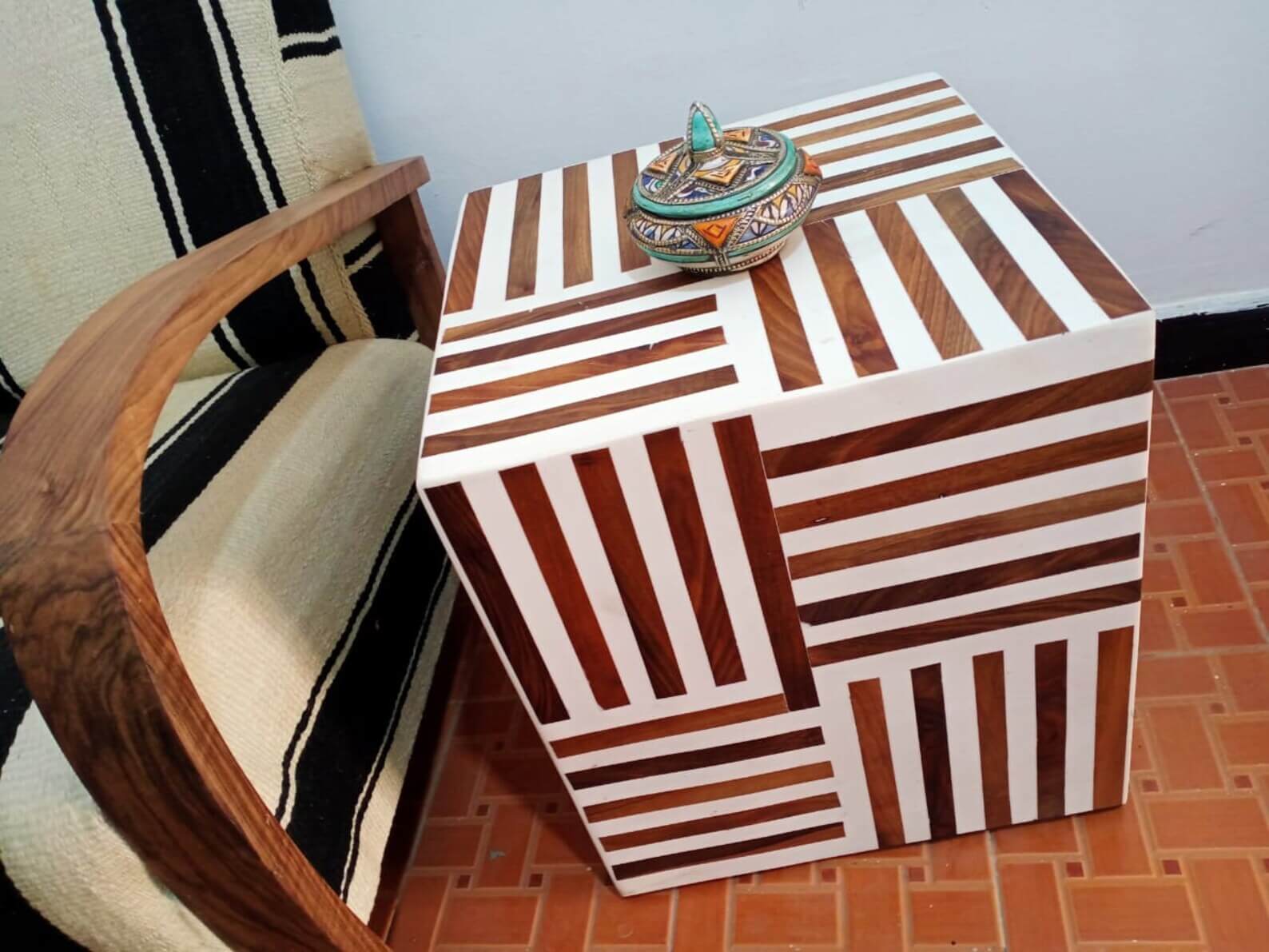 Produit : Table Cube « Sndouk Pla » – Bois de Noyer et Résine